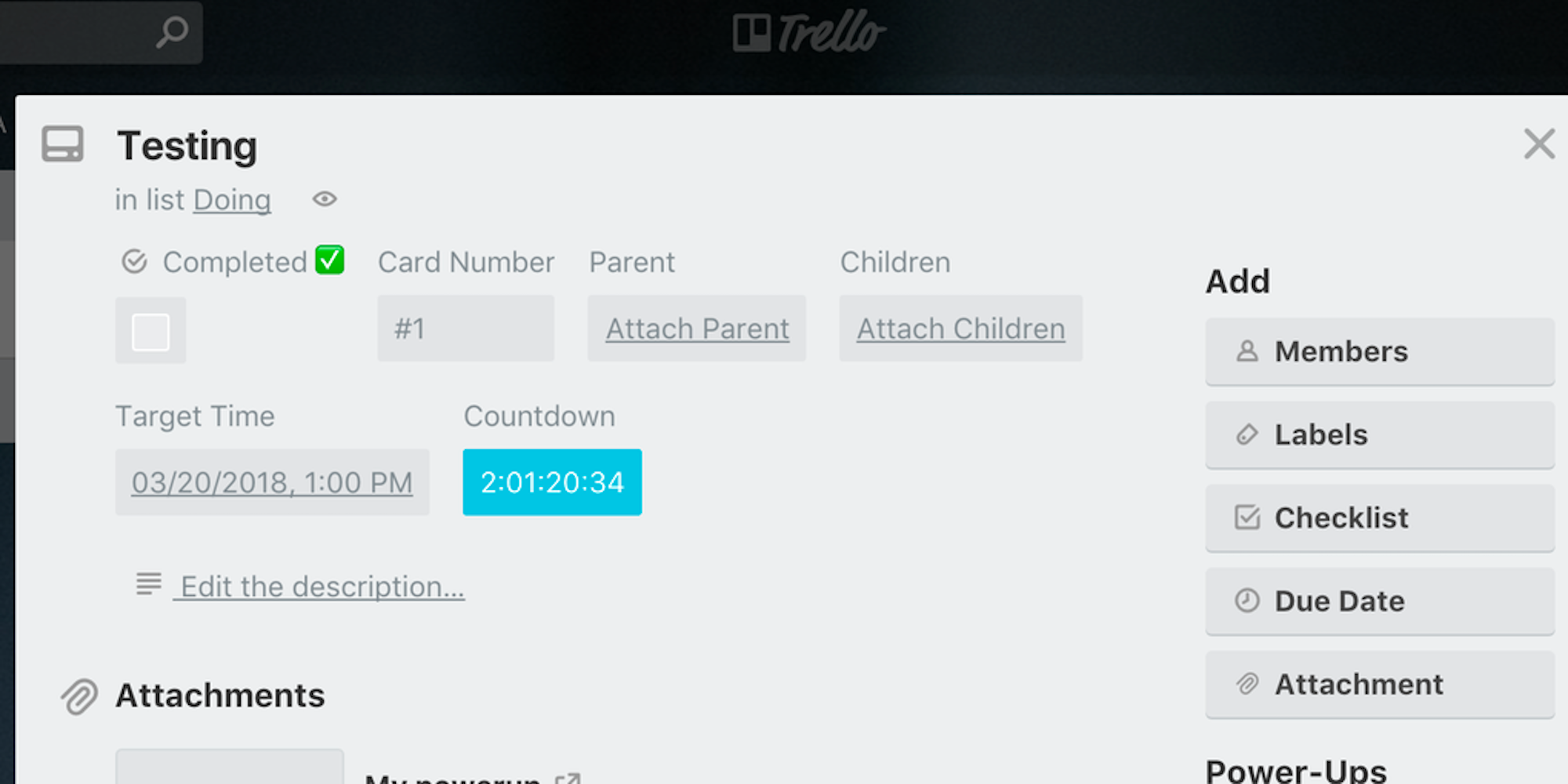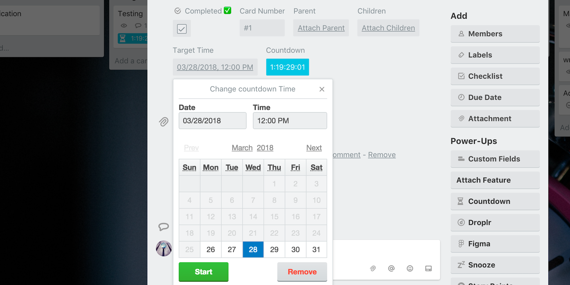 Card detail countdown showing target datetime and countdown, after setting it from countdown button.