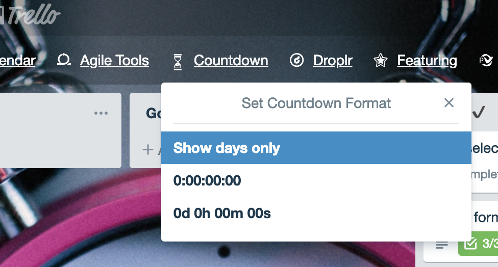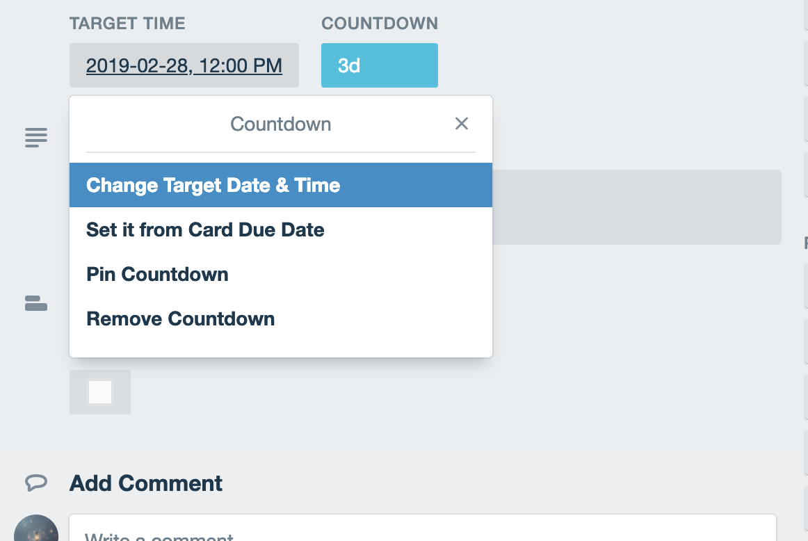 Card detail countdown showing target datetime and countdown, after setting it from countdown button.